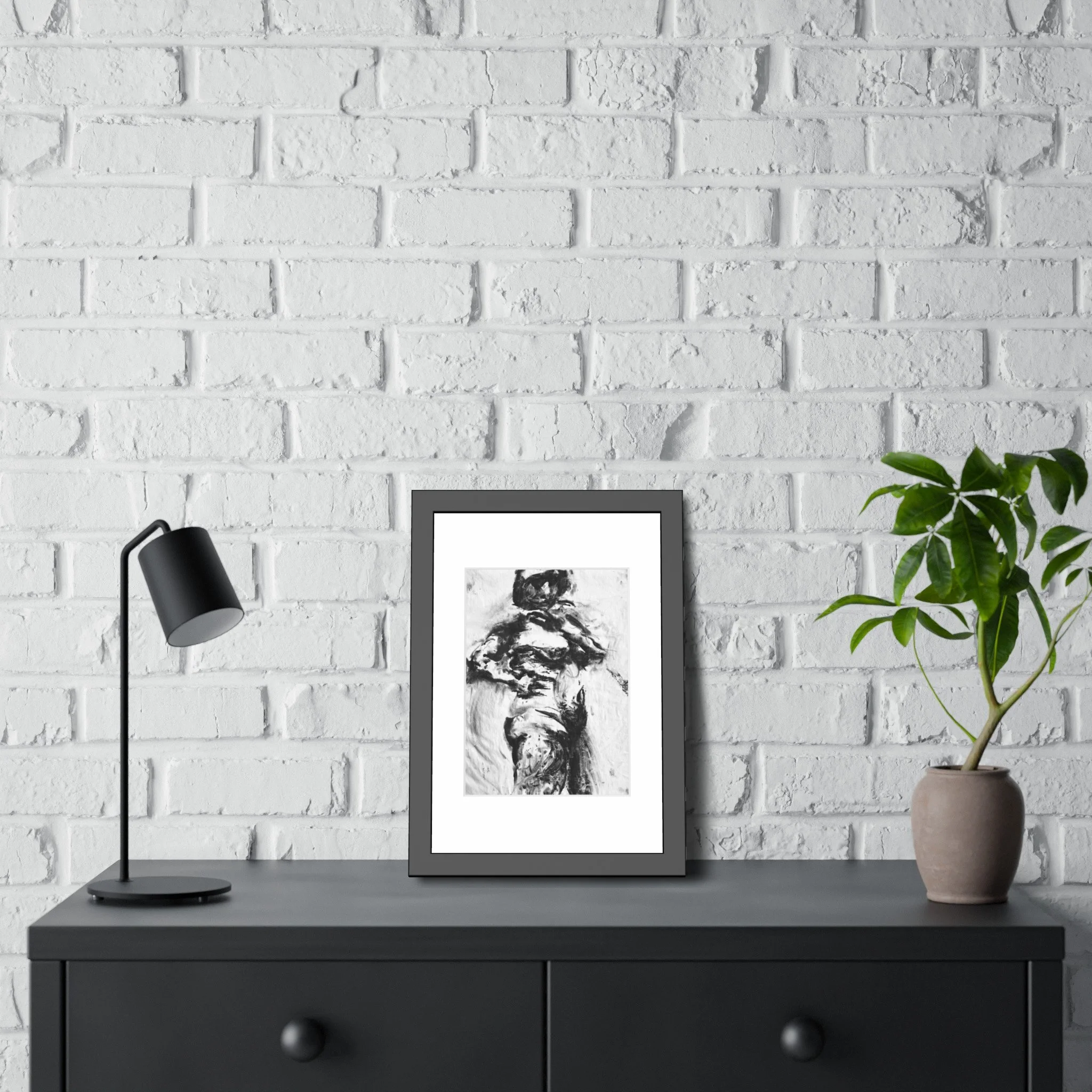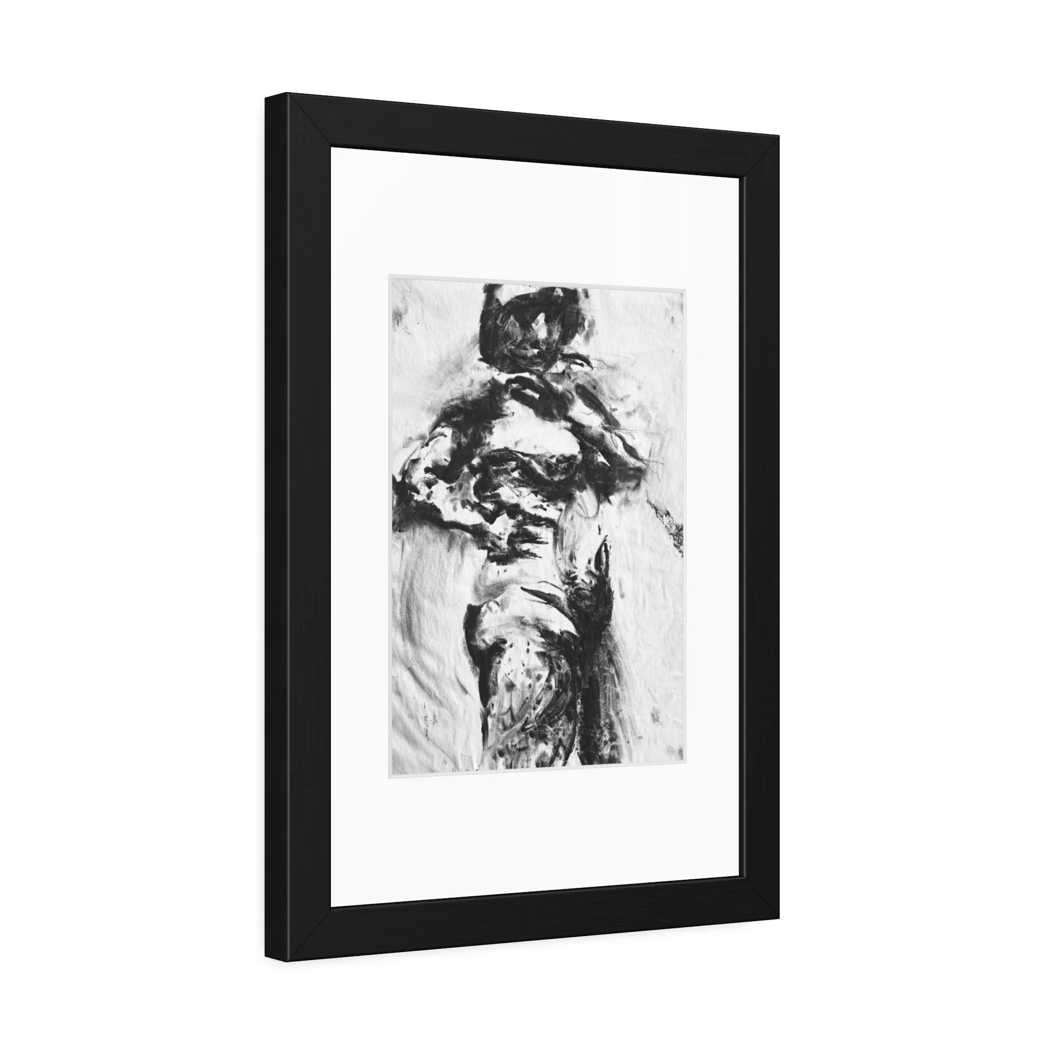 Premium 12" x 18" reproduction of ebony charcoal drawing of woman with sensual bare chest. Hand-drawn from a live model. Frame included.