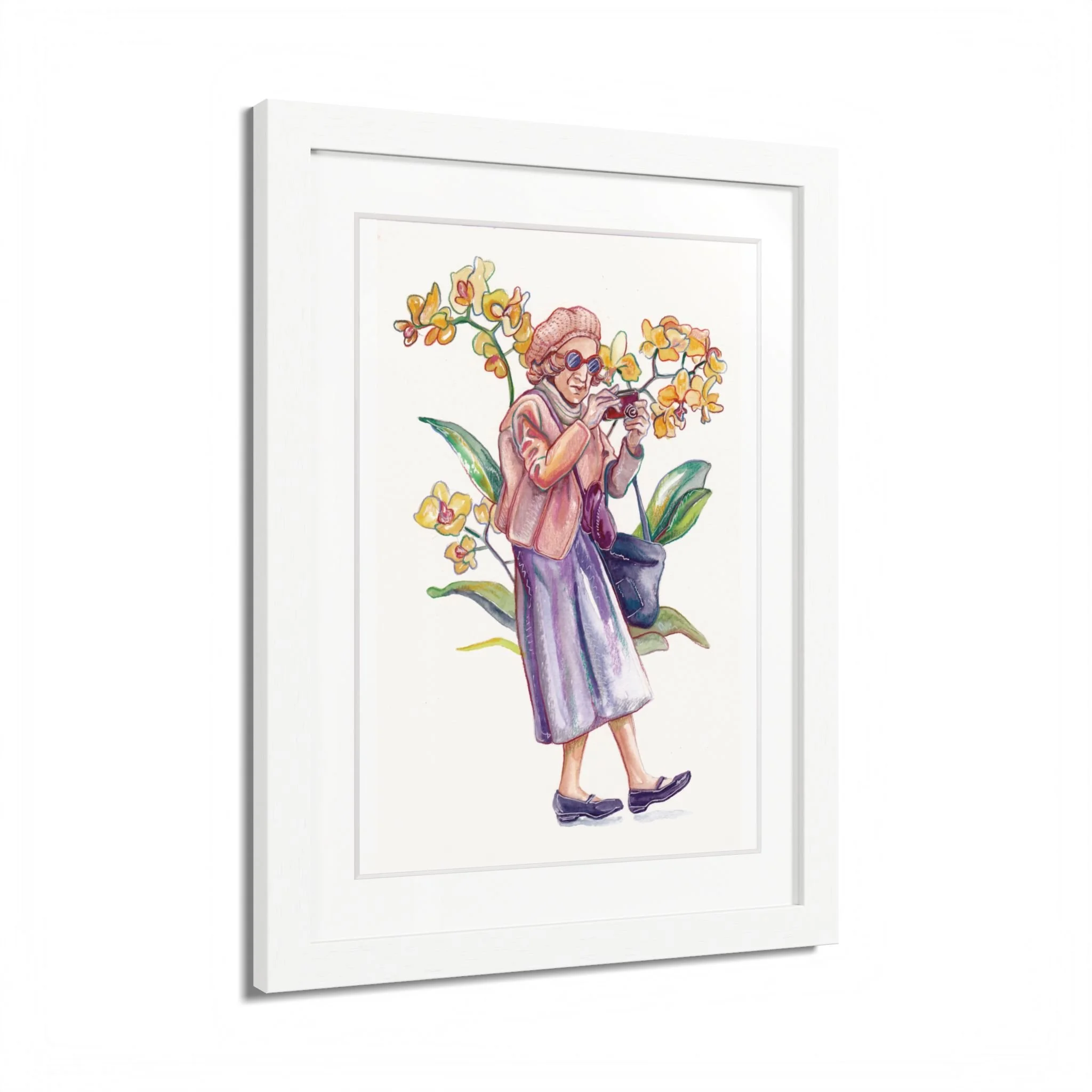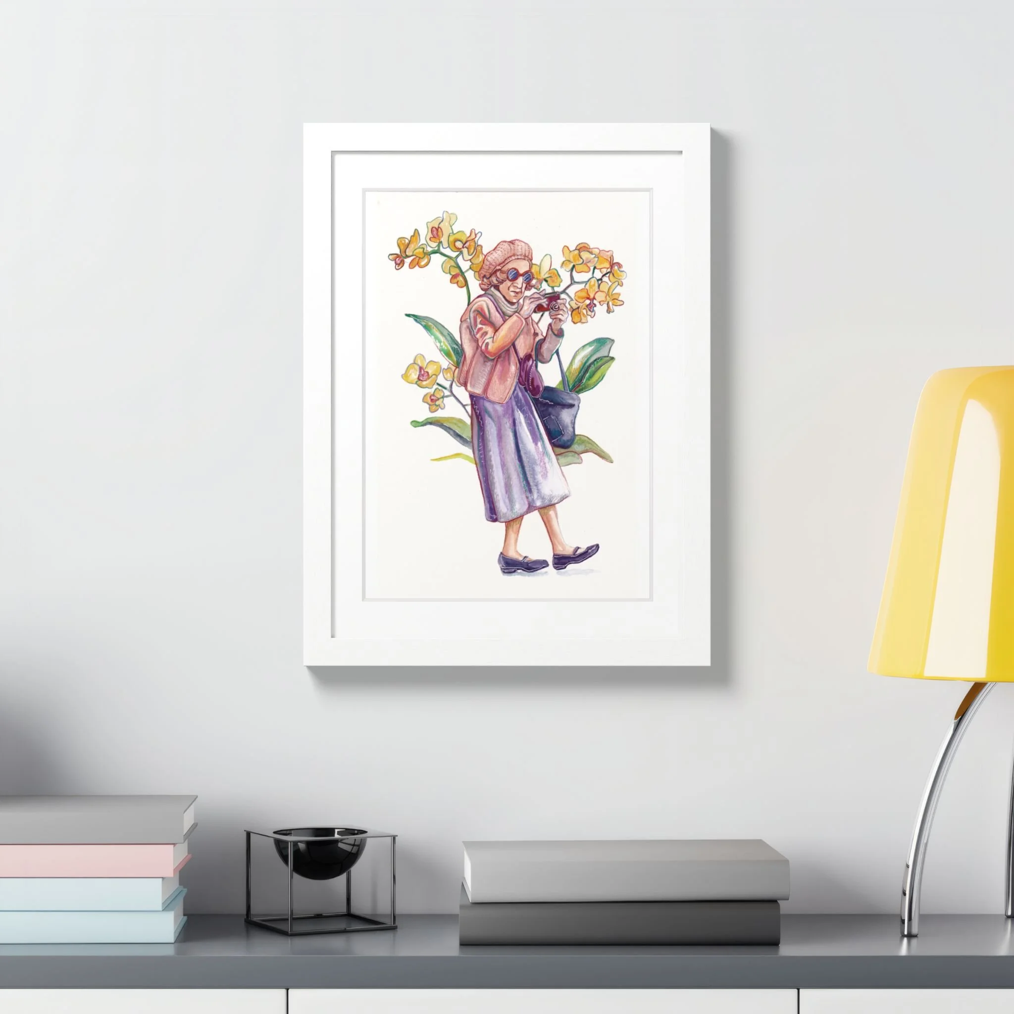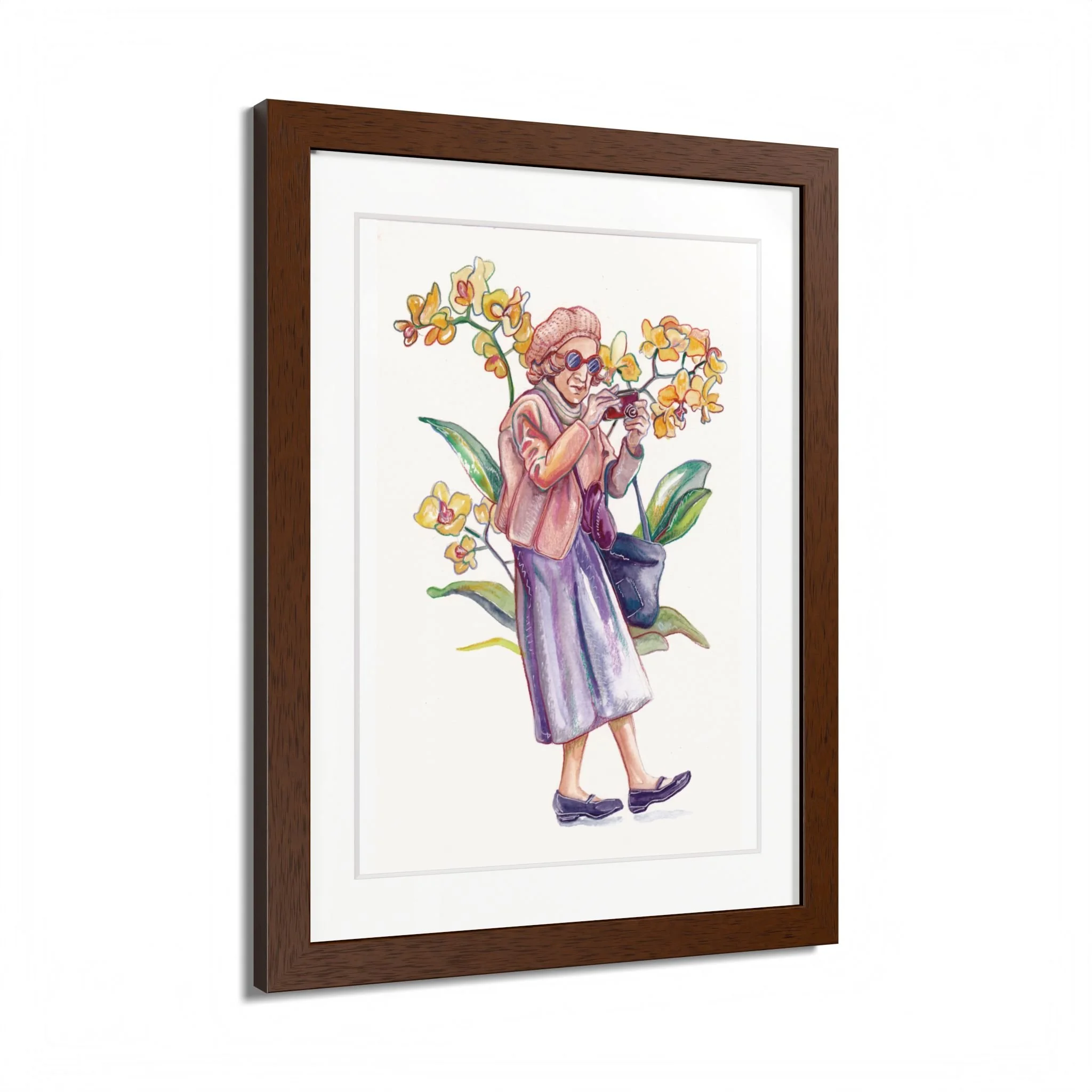 Whimsical hand-painted watercolor framed poster featuring a glam-ma with a camera and orchids. This comical, energetic, and inspiring design adds a touch of creativity to any room. Perfect for those who appreciate unique and fun artwork, this framed poster is ideal for gifting on Mother's Day, Grandparent's Day, or birthdays.