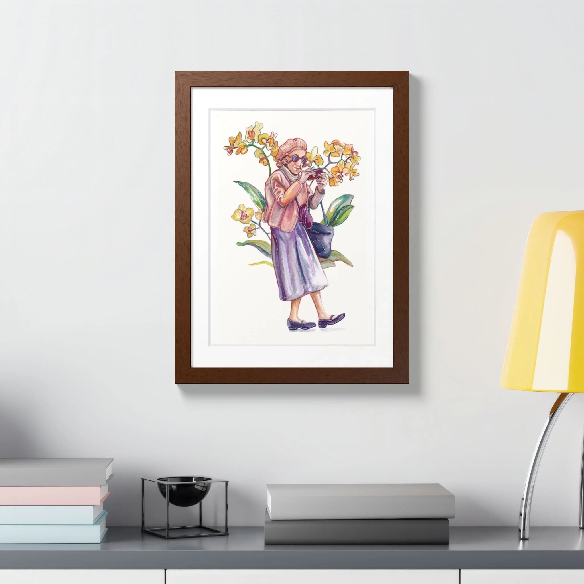 Framed Poster, 12" 16" Whimsical Watercolor of Grandma and Orchids