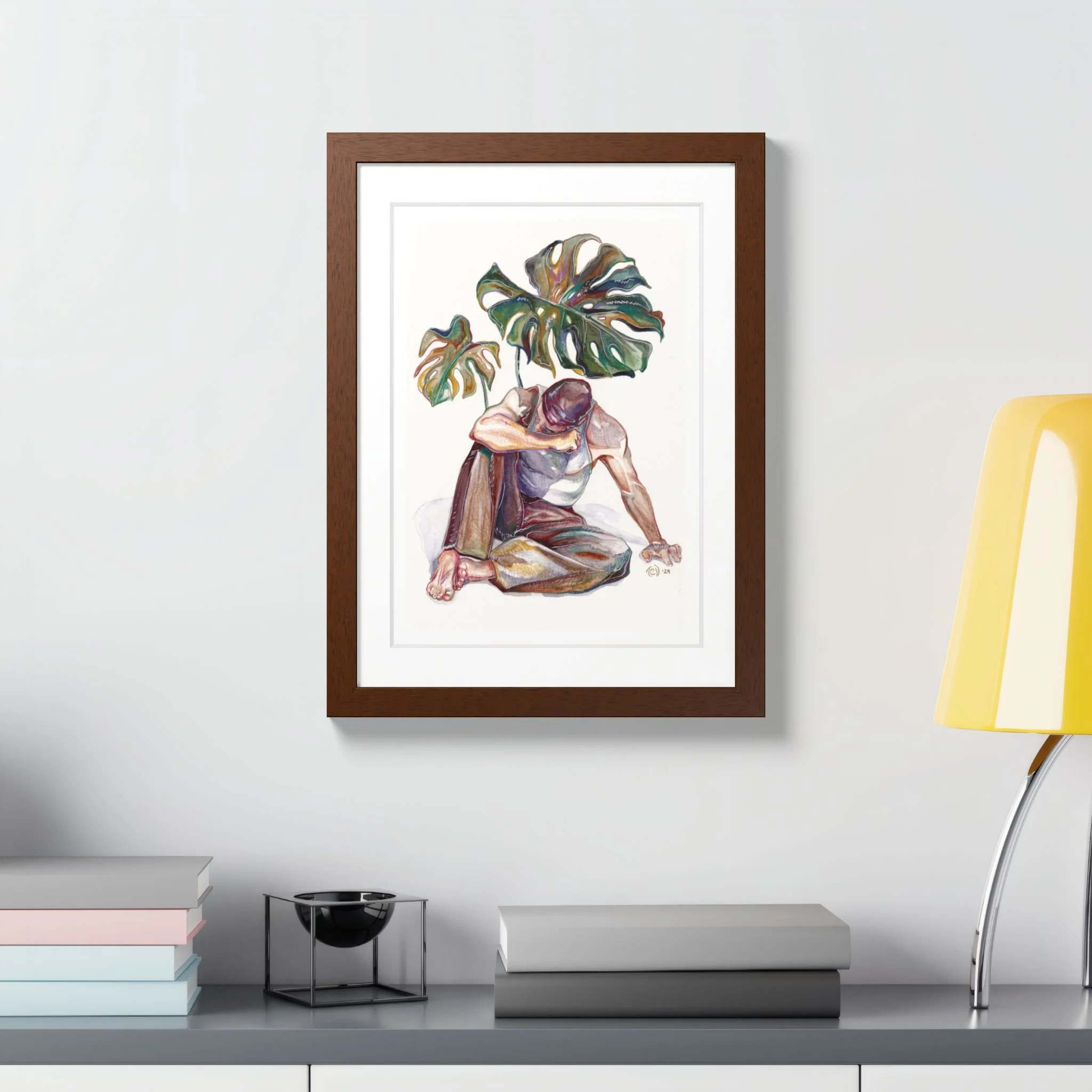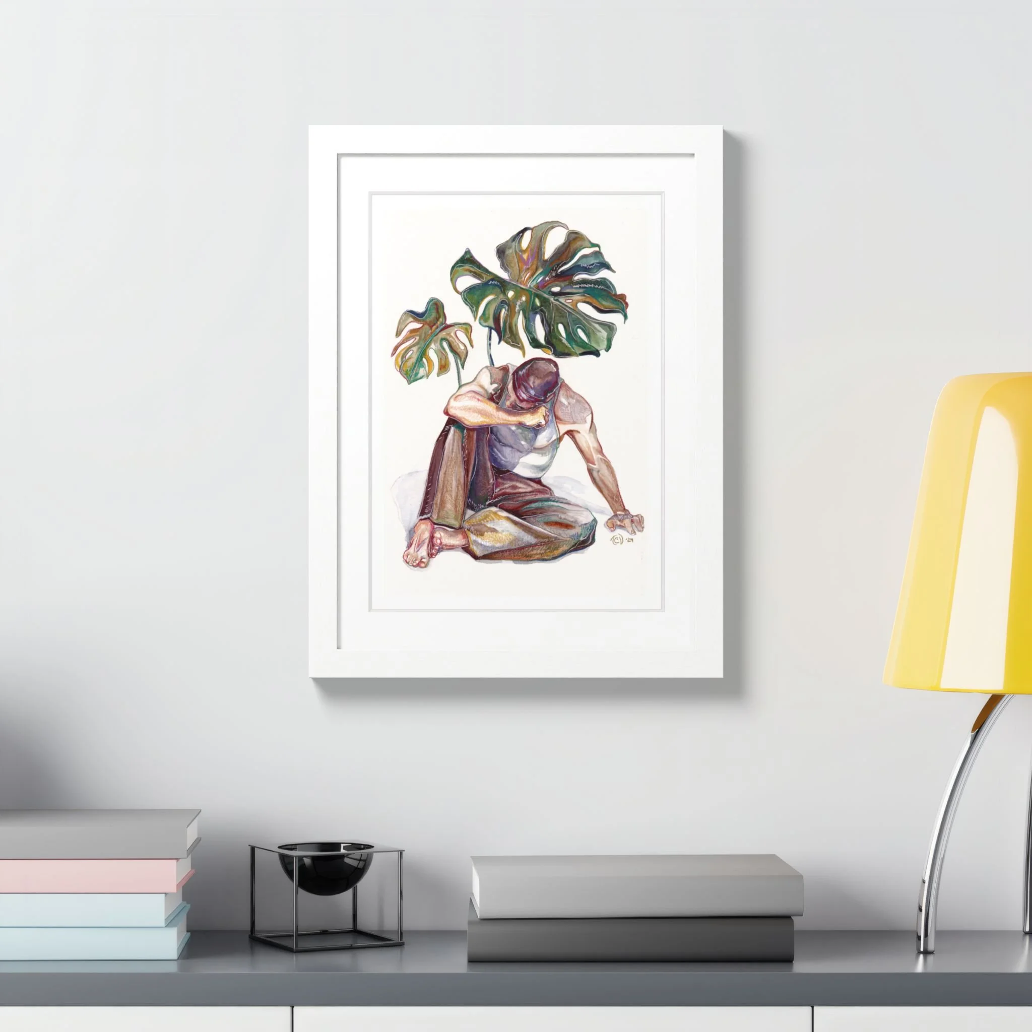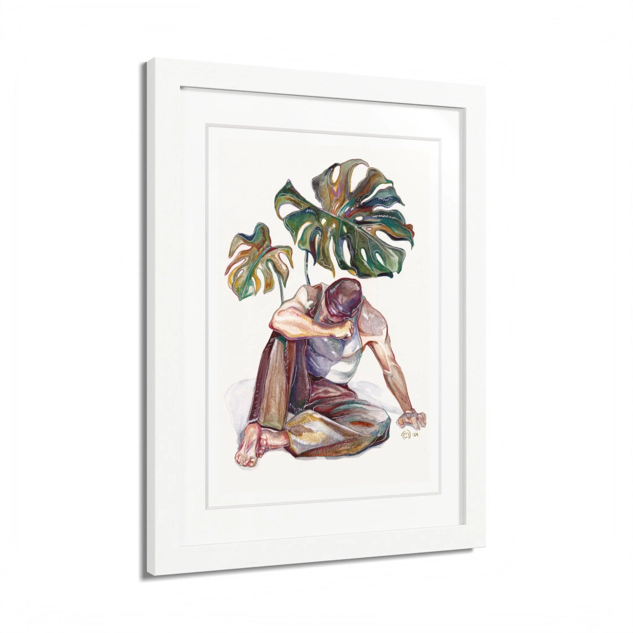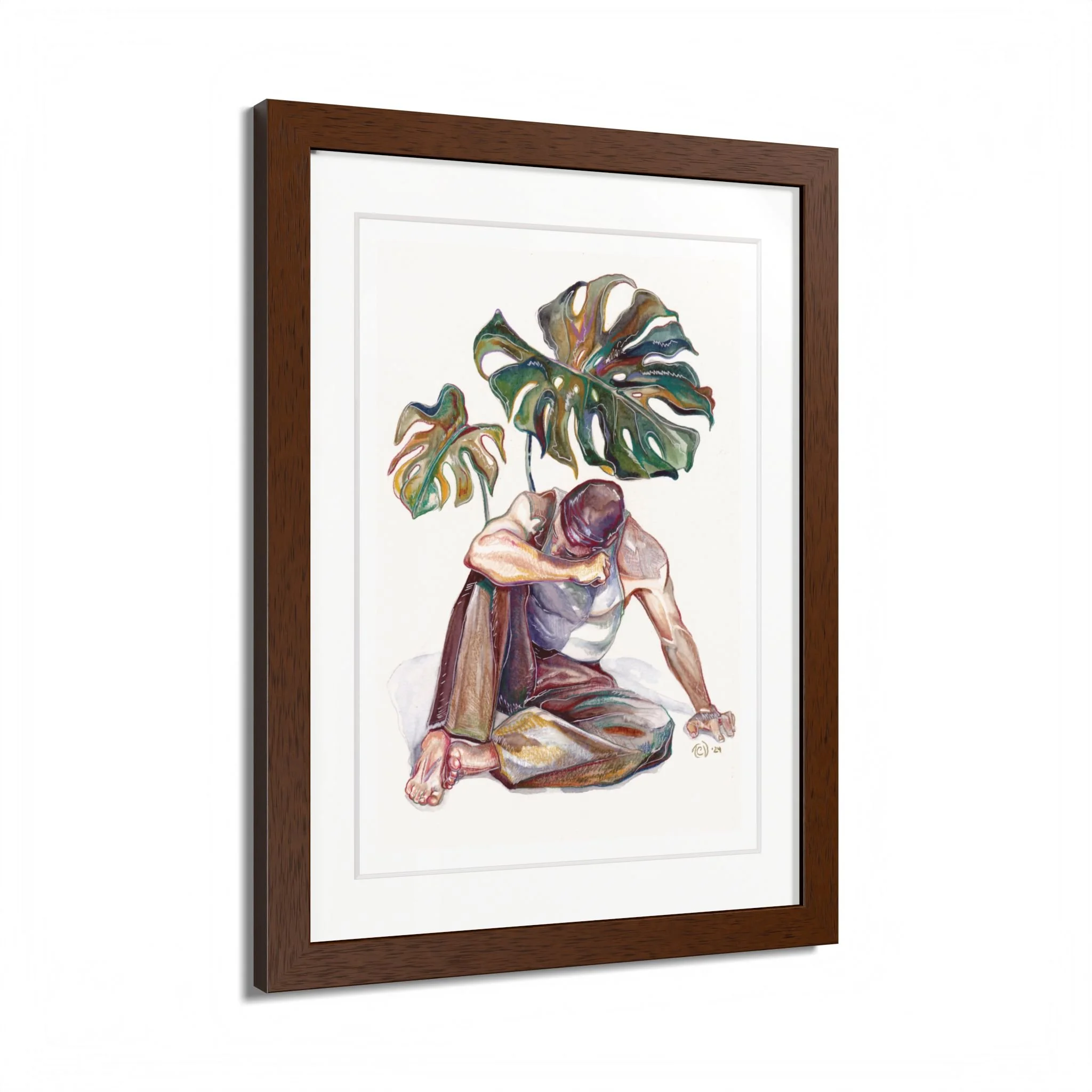 A mysterious framed poster featuring a hand-painted watercolor of a boy napping under monstera leaves. The serene design creates a calming atmosphere perfect for a nursery. Ideal for art lovers, nature enthusiasts, and those who appreciate a touch of whimsy in their decor. Great for gifting on birthdays, holidays, or just to add a unique touch to any celebration.