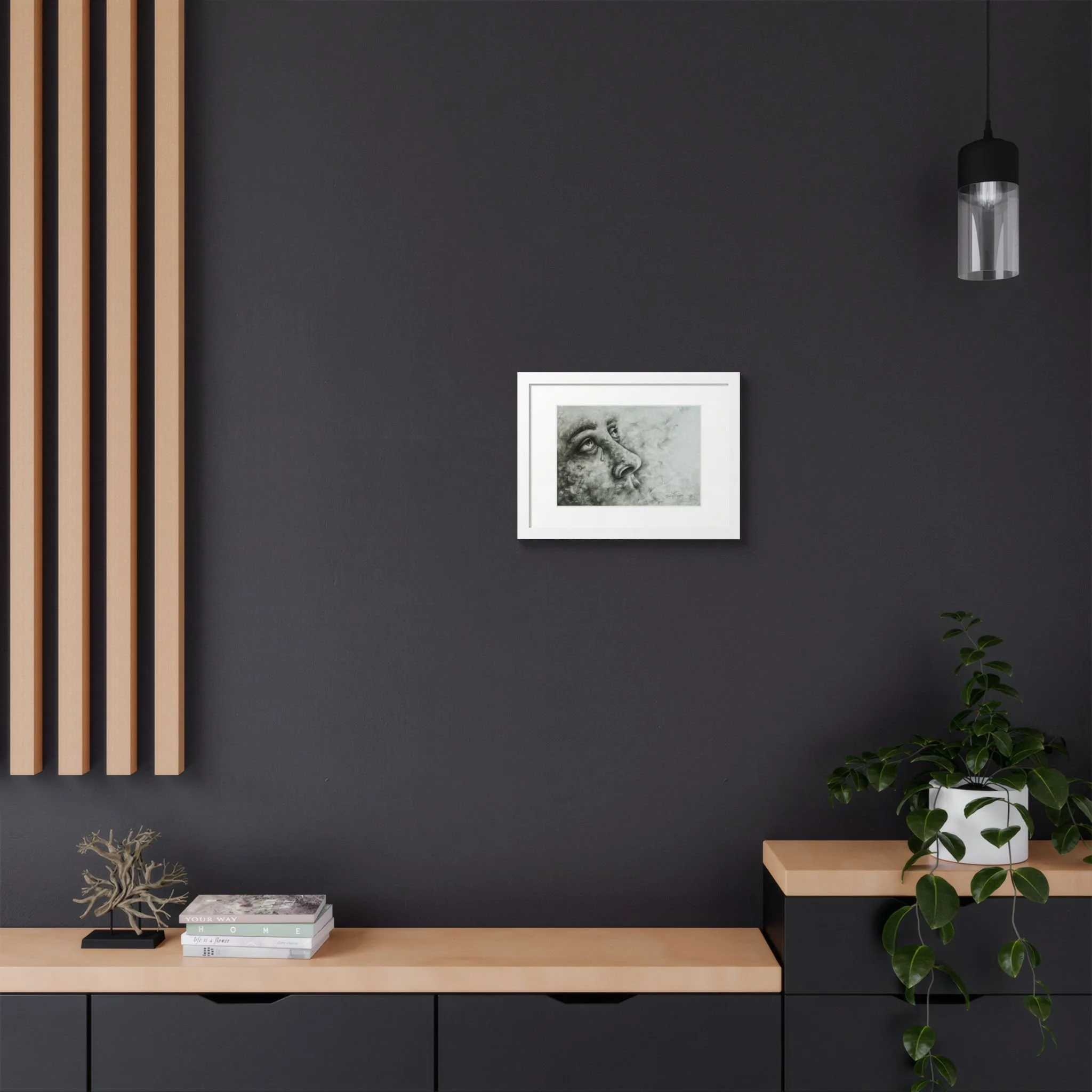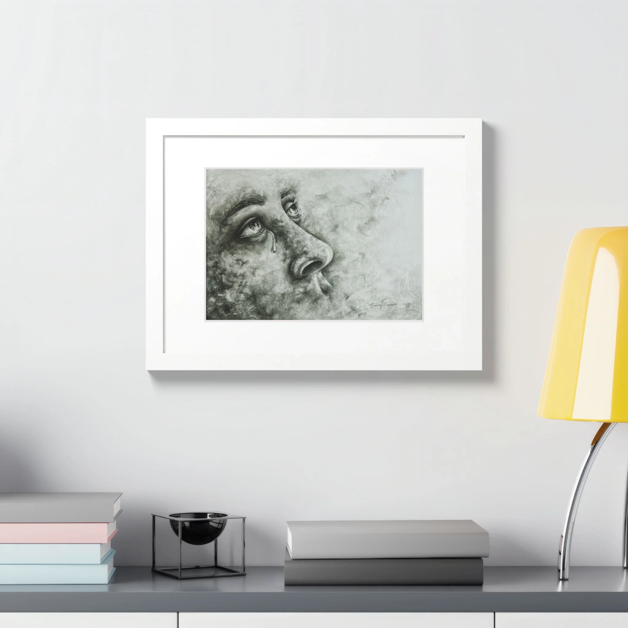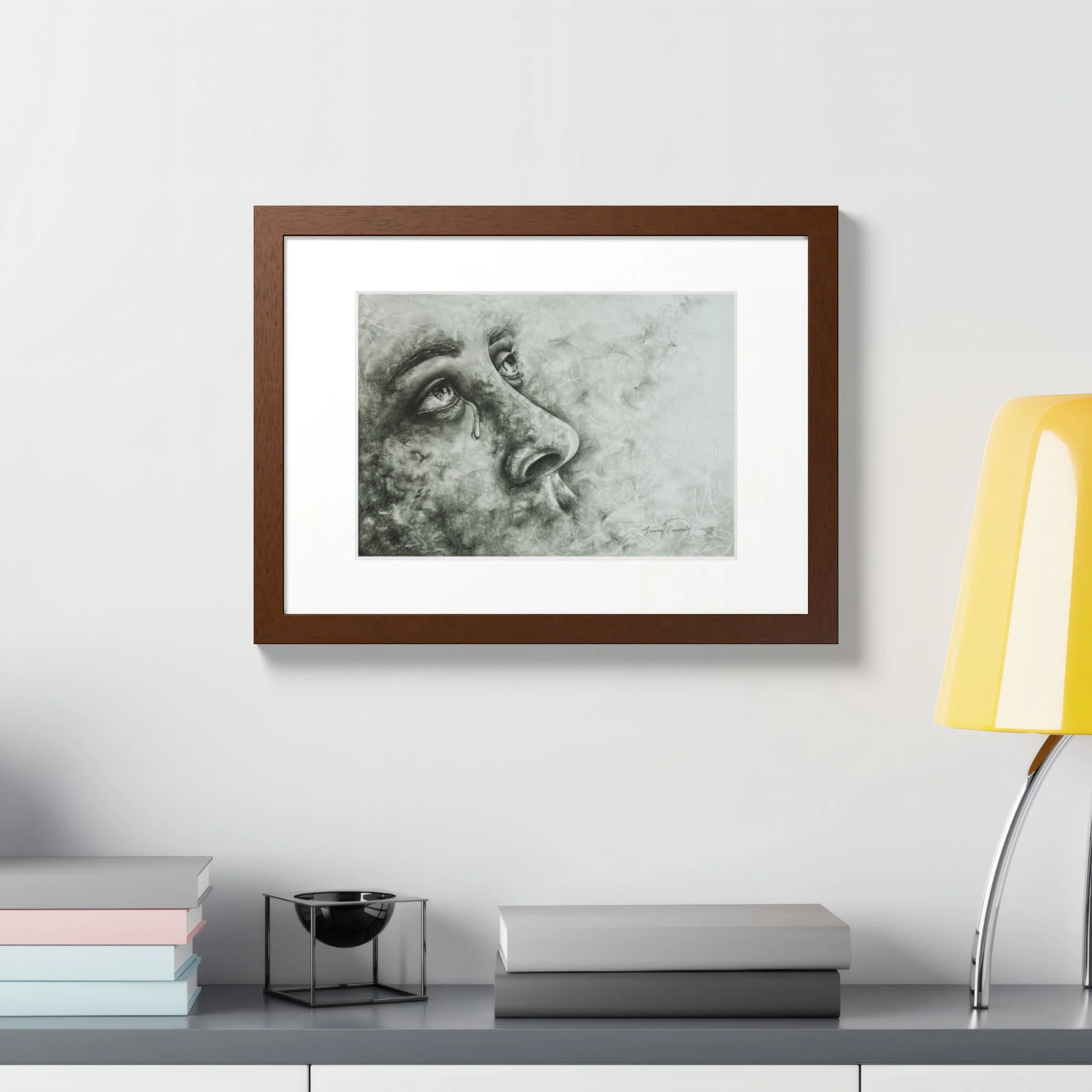 Framed Poster, 16" x 12" Surreal Hand-Drawn Graphite Portrait of Face Emerging from Smoke, Whimsical and Dramatic