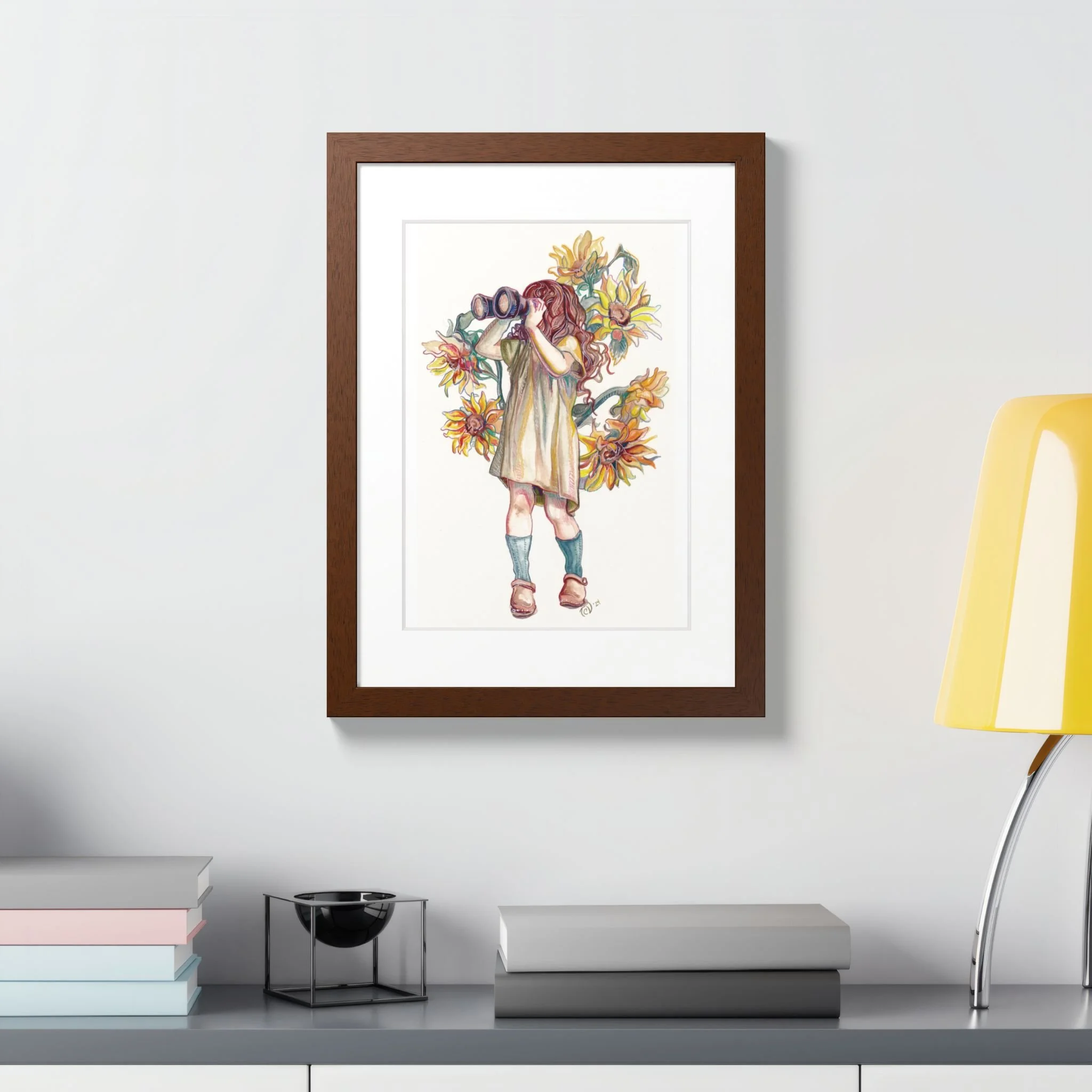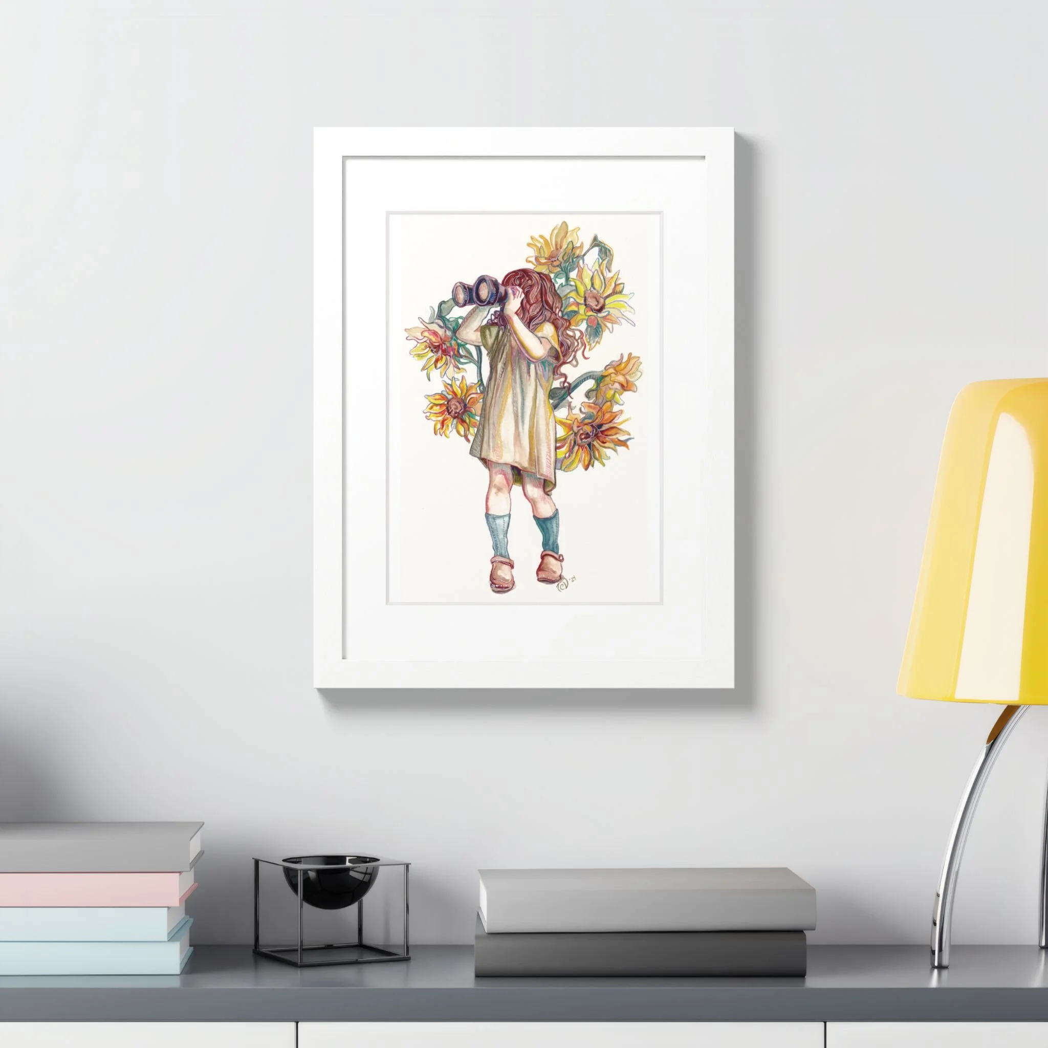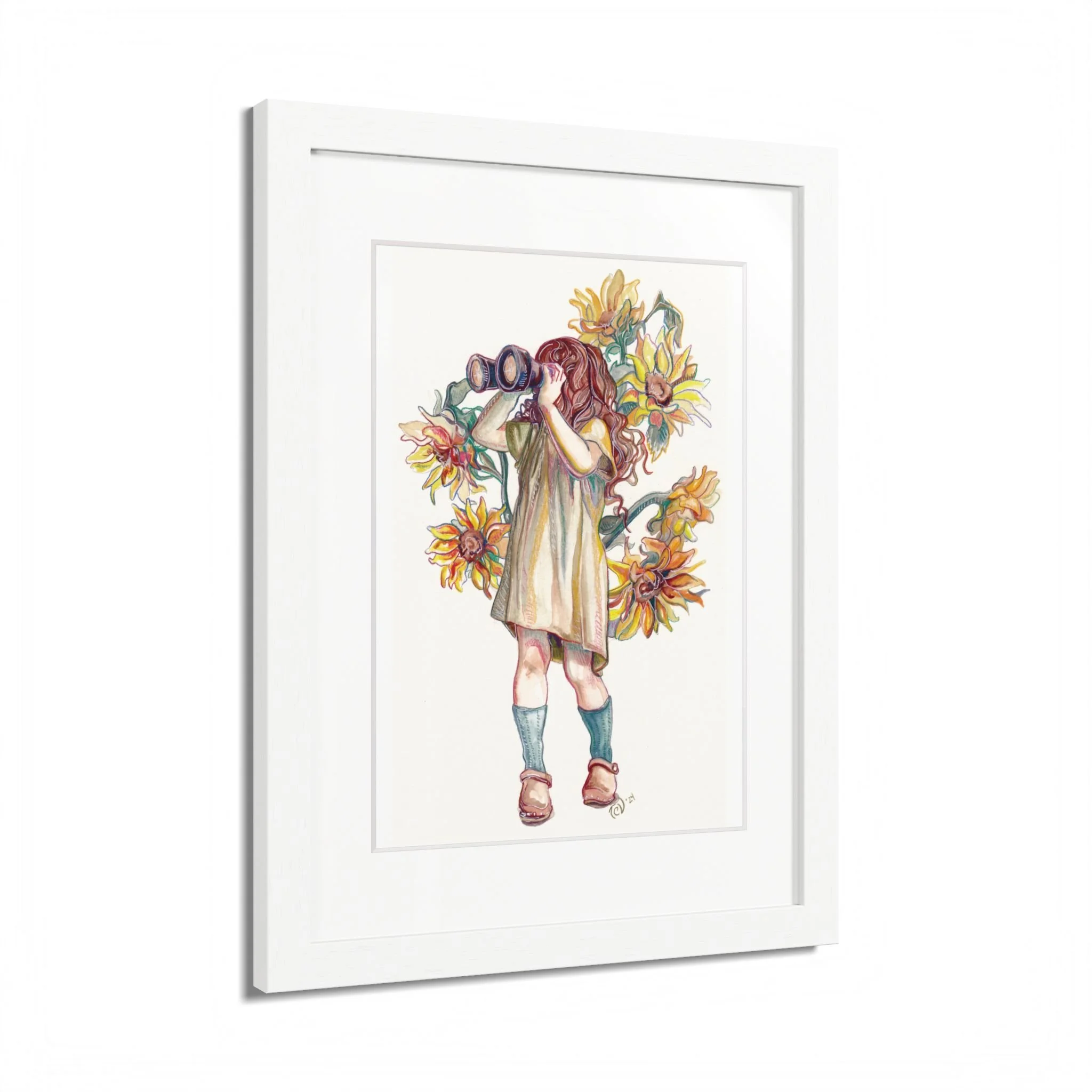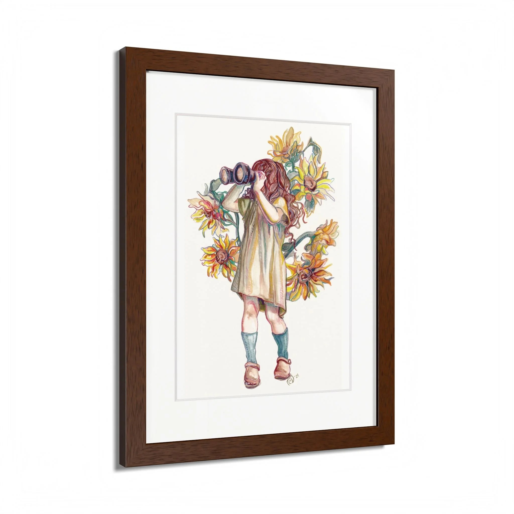 A vibrant hand-painted watercolor of a little girl looking through binoculars with sunflowers in the background. This framed poster exudes wonder, awe, innocence, and nostalgia, making it a perfect addition to a nursery or a child's bedroom. Ideal for anyone who loves whimsical and artistic decor, this poster is great for gift-giving on birthdays, baby showers, or any special occasion.