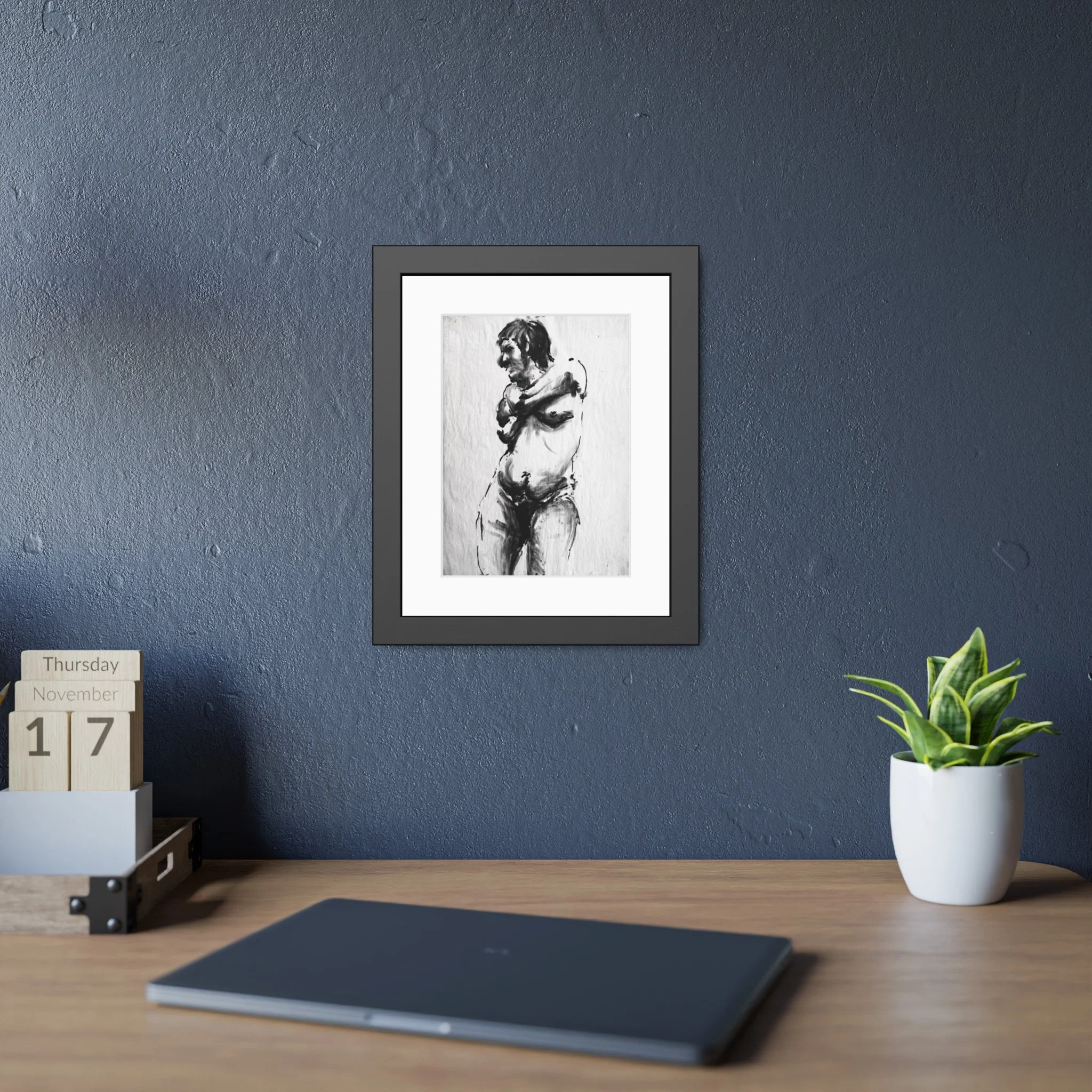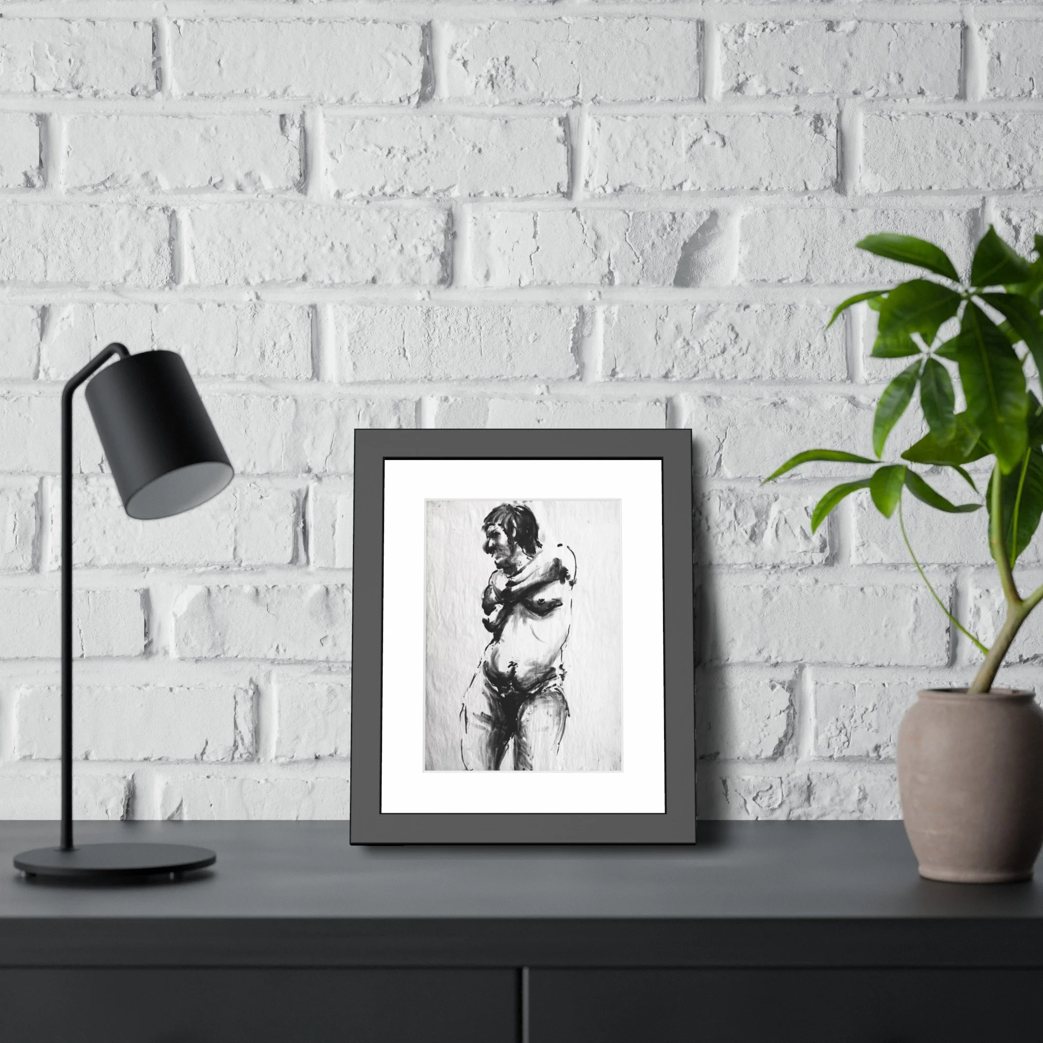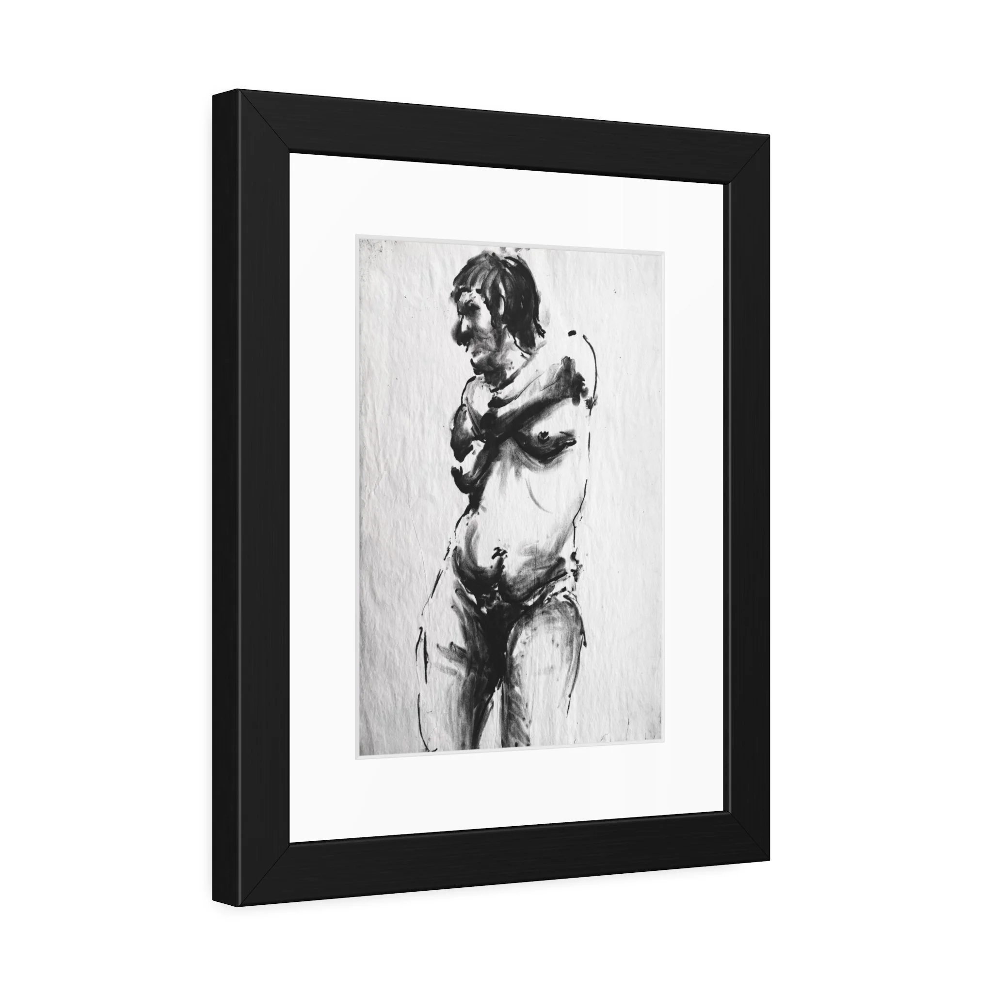 Premium 11" x 14" reproduction of ebony charcoal drawing of women with sensual bare chest. Hand-drawn from a live model. Frame included.